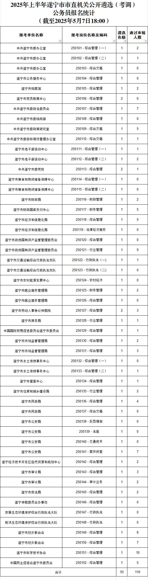 2025年上半年遂宁市市直机关公开遴选(考调)公务员报名统计(截至2025年5月7日18:00)