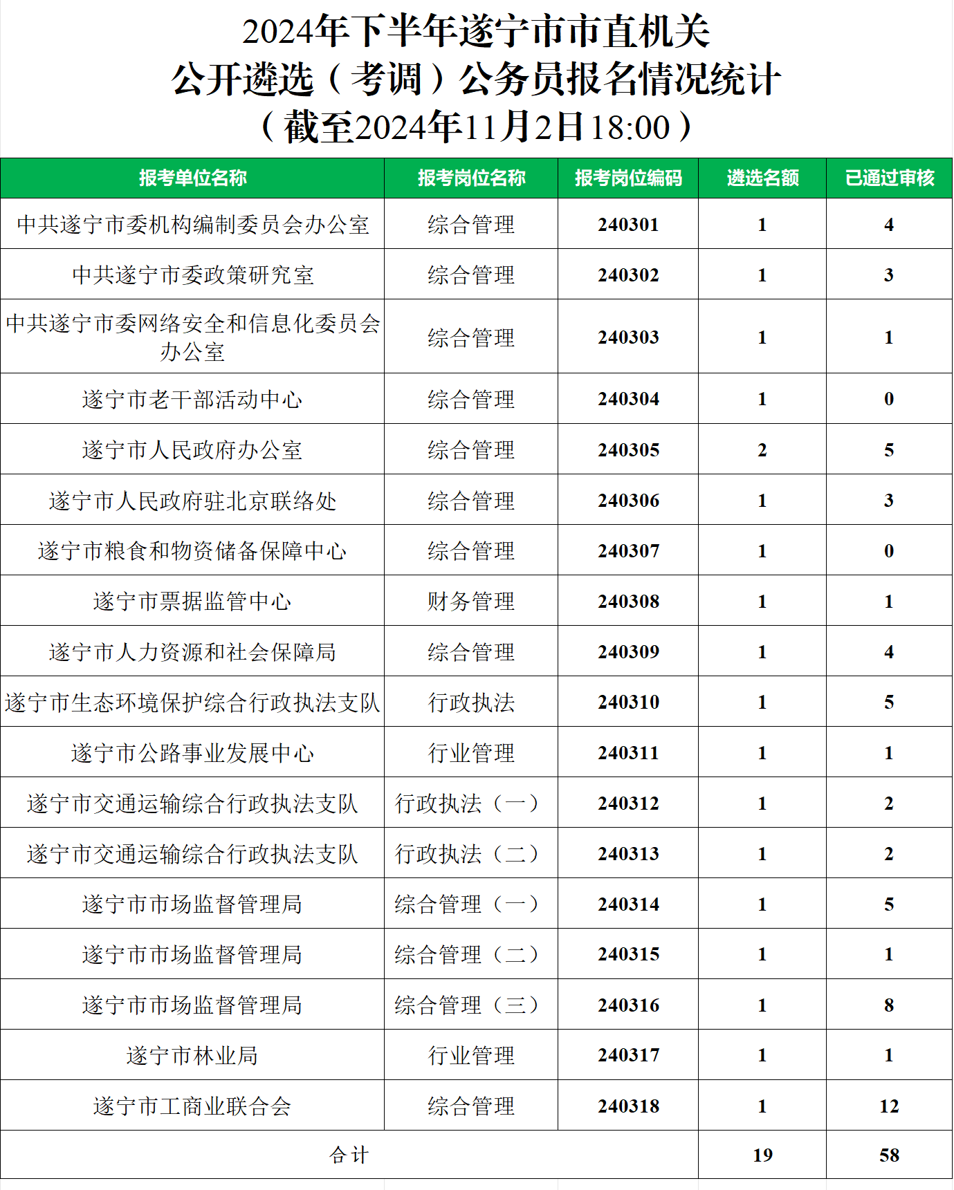 2024年下半年遂宁市市直机关 公开遴选(考调)公务员报名情况统计 (截至2024年11月2日18:00)