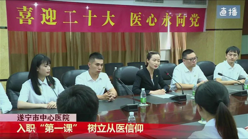 直播还对医院庆祝第五个中国医师节暨先进个人表彰会、新入职医师“入职第一课”等活动进行了现场连线。表彰会上,医院领导宣读了中共遂宁市委、遂宁市人民政府致全市医务工作者的慰问信,激发了医务工作者进一步干事创业、守护健康的激情。遂宁市中心医院院领导向新入职医师分享自己的成长经历,寄语新员工们牢记身为医者的初心和使命,系好“白大褂”的“第一颗扣子”,在直播间引起了强烈反响。