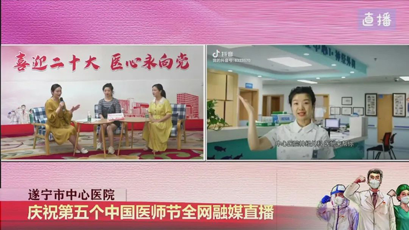 在医院近50个科室、100多名医务人员配合下,医院以9小时大直播的方式庆祝第五个中国医师节的到来,整个直播活动共制作了26个短视频,进行了60多次现场连线,首次采用慢直播+短视频+现场访谈+跨区域多视窗多点连线的方式,在封面新闻的官微、视频号、客户端,以及船山融媒、遂宁市中心医院视频号等多个平台同步直播,总观看量117万+人次。
