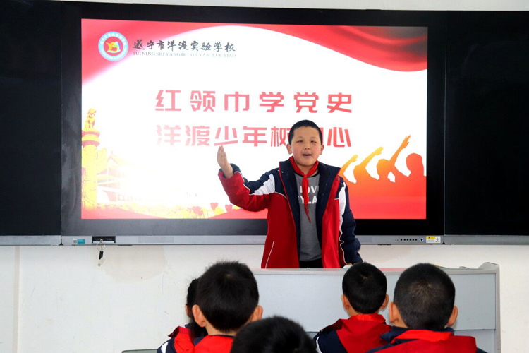 “红领巾飘呀飘起来,队旗飘飘放光彩,星星给我梦,火炬给我爱,亲爱的党对我们最关怀……”河东新区紫竹路小学少先队员通过合唱《中国少年先锋队队歌》,讲述刘胡兰、董存瑞英雄故事等形式,坚定爱党爱国信念,树立报效祖国理想,让胸前的红领巾更加鲜艳。