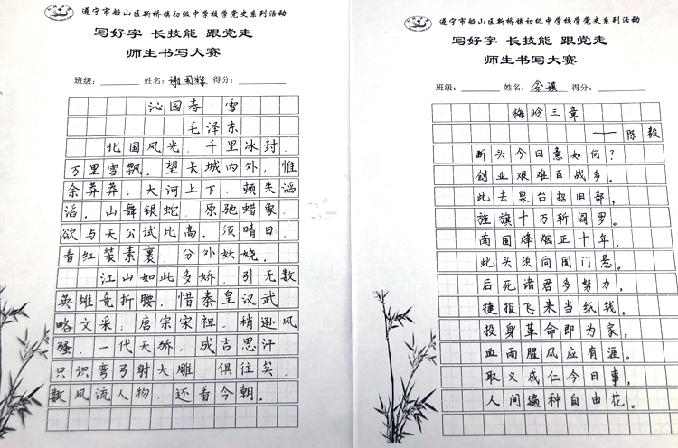 活动中,全校师生一起参加了“写好字、长技能、跟党走”革命题材诗歌书写大赛和党史知识现场问答,全校师生400余人通过书写革命古诗词、党史知识趣味问答的形式,引导广大青少年厚植爱党、爱国的情感,让红色基因、革命薪火代代传承。经过紧张的角逐,大赛现场评出了教师一等奖10人,学生一等奖9人,二等奖13人,三等奖24人。