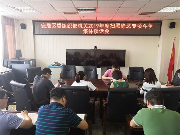 近日,安居区委组织部召开2019年度扫黑除恶专项斗争集体谈话会。会议介绍了扫黑除恶专项斗争开展情况,分析了前期工作中存在的问题,传达了中省市重要决策部署,对各股室负责人提出了四点要求。