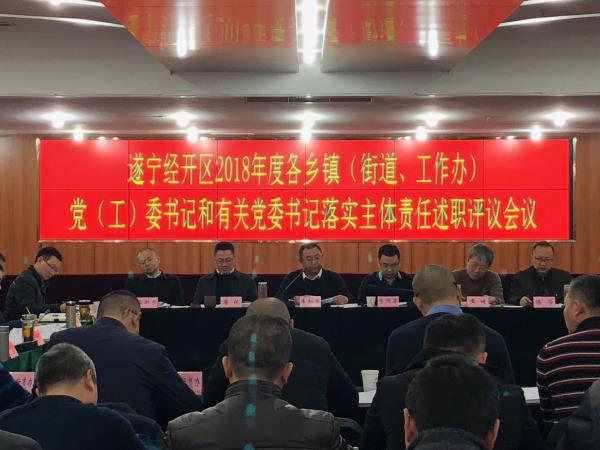 1月14日,经开区召开2018年度各乡镇(街道、工作办)党(工)委书记和有关党委书记落实主体责任述职评议会议。各乡镇(街道、工作办)党(工)委和行业(系统)党委书记,党建工作领导小组成员单位主要负责人,基层一线党员代表等90余人参会。