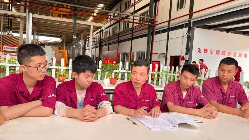 杨明(中)与企业员工一起学习省第十二次党代会精神