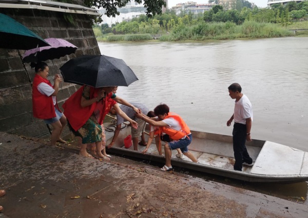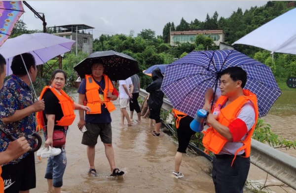 图为:蓬莱镇机关、寸塘口村党支部党员干部有序疏导转移寸塘口水库沿岸群众撤离。