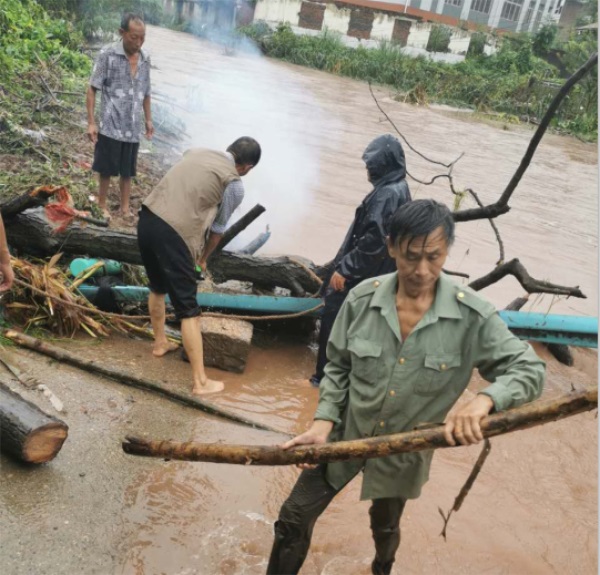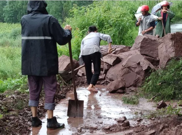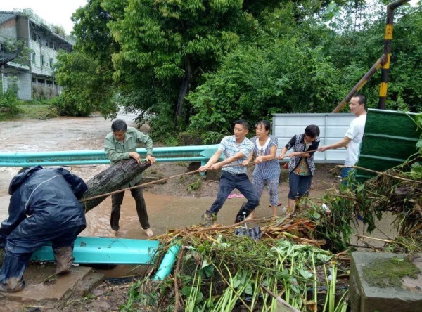 图为:蓬莱镇福荣村支部书记钱钊(左三)组织党员群众冒雨排除道路障碍物。