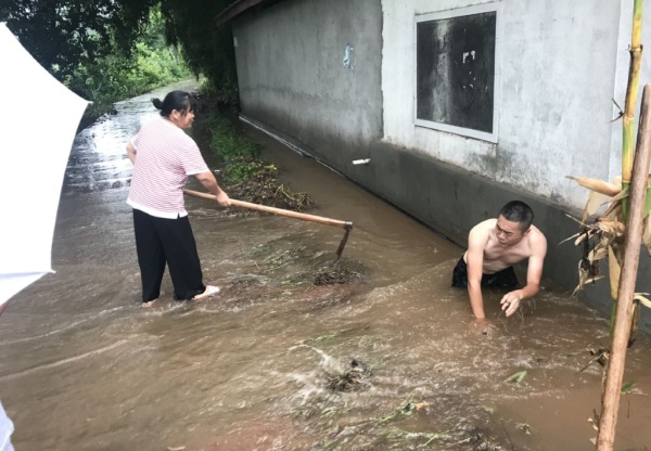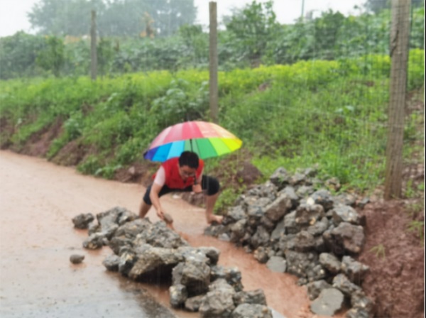 图为:蓬莱镇桅杆坝村(原豪子口村)驻村工作队队员鲜江涛冒雨疏通混泥土块排除积水。
