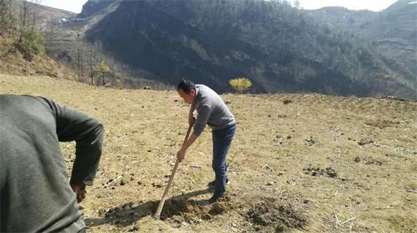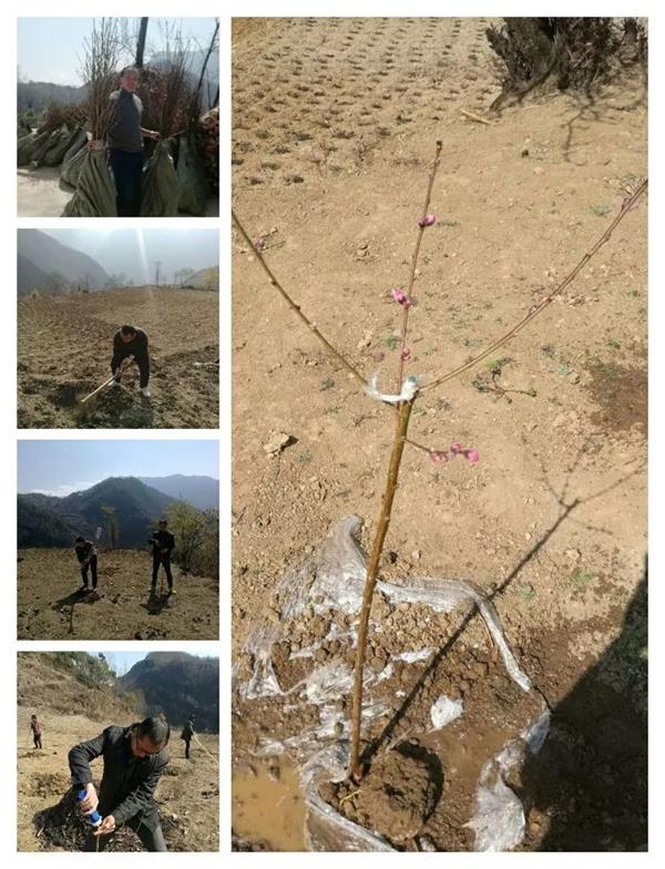 在村两委选定桃苗后,帮扶单位射洪县精神卫生中心立即给予产业扶贫资金1万元购买丽江雪桃苗,于2019年3月12日下午抵达洛村。杨兵和其他驻村工作队员随即组织村民栽种。