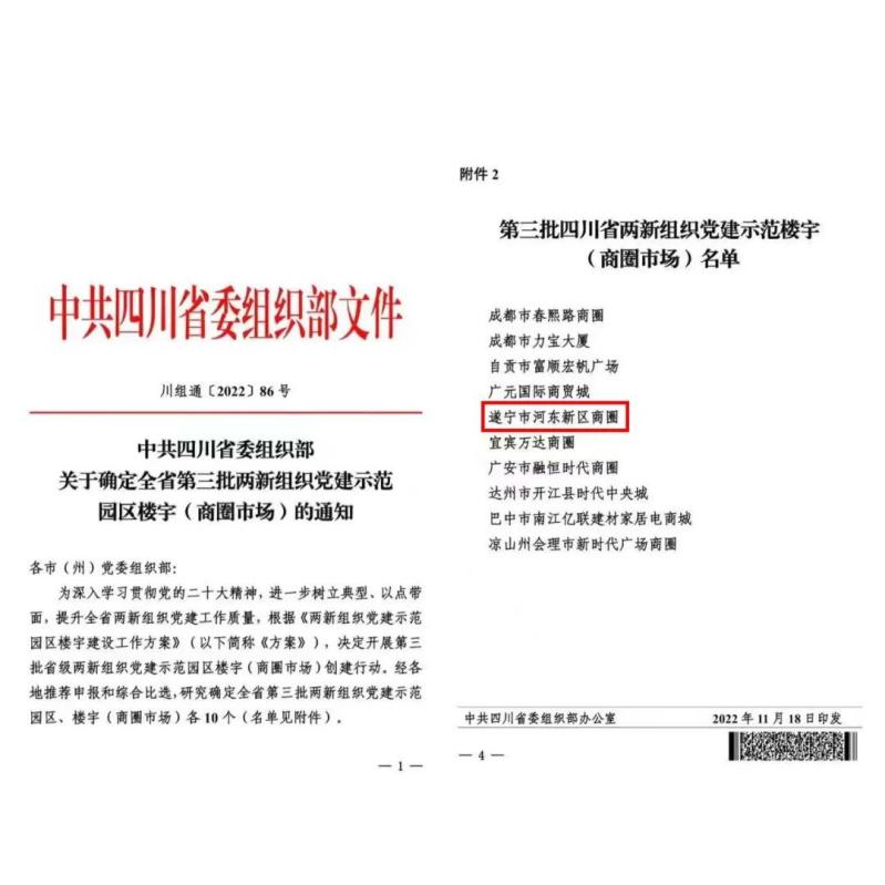 为深入学习贯彻党的二十大精神,进一步树立典型、以点带面,提升两新组织党建工作质量,近日,省委组织部根据《两新组织党建示范园区楼宇建设工作方案》,经各地推荐申报和综合评选,发布了第三批省级两新组织党建示范园区楼宇(商圈市场)名单,遂宁市河东新区商圈被评为全省两新组织党建示范商圈。