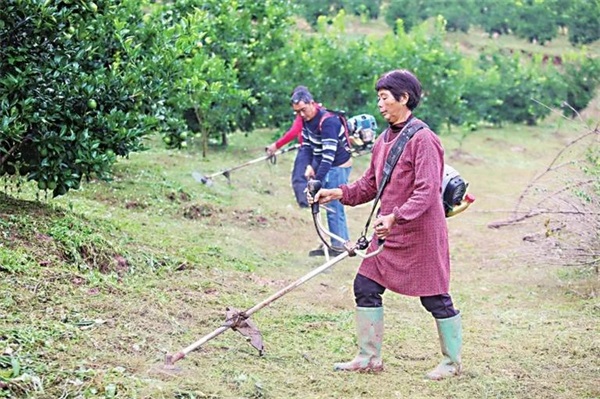 10月22日,趁着晴好天气,白庙村脱贫户岳蕴会一大早就与工友们来到柑橘园开展除草作业。