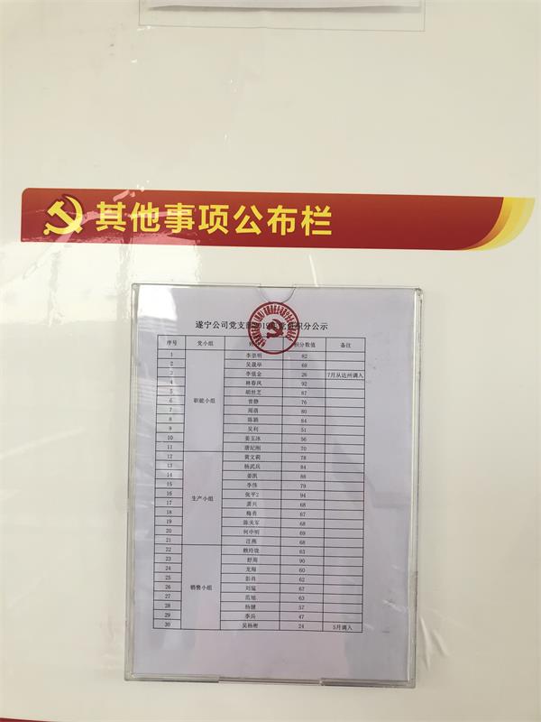 制定《党员积分制管理办法》,设置党员日常行为、年度绩效等级评价、年度评议、加减分和否决项五项考核内容,将党员日常行为、岗位业绩、三会一课、结对帮扶等内容实行百分制量化考核,推动党员示范支部建设。2019年华润雪花遂宁分公司党支部获得雪花啤酒四川区域“五好党支部”称号、遂宁经开区非公企业“十有”党建示范企业。