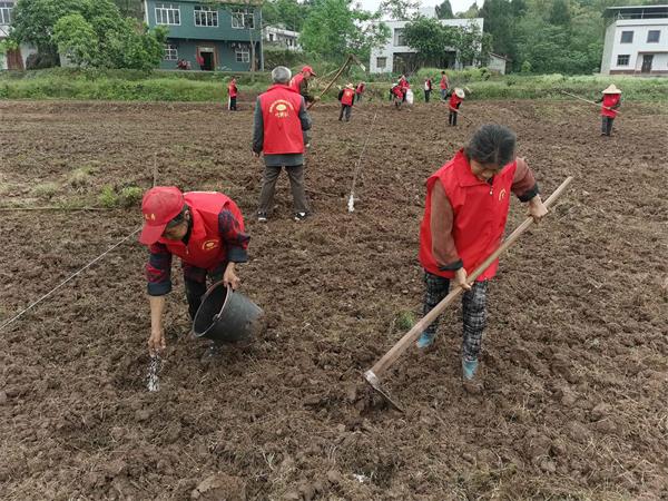 日前,在蓬溪县蓬南镇兴旺村的奔康产业园内,新整理出来的30余亩撂荒地已复耕,种上了甜糯玉米,十余名村民在地里忙着除草、施肥。