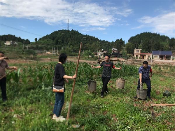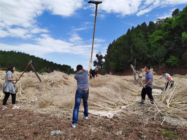 5月9日,大英县委组织部机关党支部到联系帮扶村蓬莱镇柏岭村开展“大战红五月・党员到田间”主题党日活动,帮助贫困户李文兴抢收油菜籽。