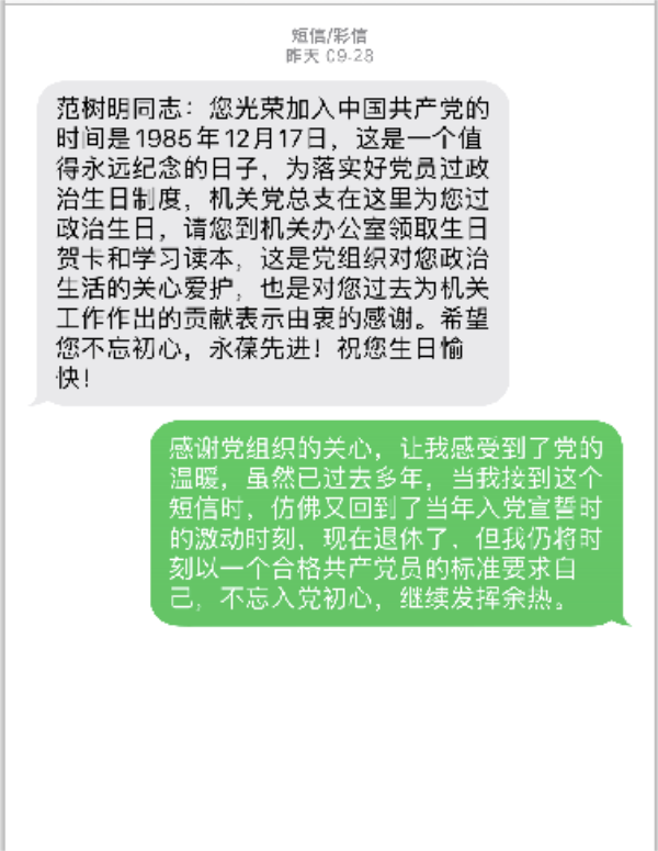“范树明同志:您光荣加入中国共产党的时间是1985年12月17日,这是一个值得永远纪念的日子,为落实好党员过政治生日制度,机关党总支在这里为您过政治生日,请您到机关办公室领取生日贺卡和学习读本,这是党组织对您政治生活的关心爱护,也是对您过去为机关工作作出的贡献表示由衷的感谢。希望您不忘初心,永葆先进!祝您生日愉快!”12月17日,已退休在家的老党员范树明接收到了一条特殊的生日短信。
