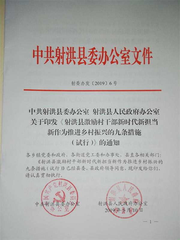 近日,射洪县制定出台《射洪县激励村干部新时代新担当新作为推进乡村振兴的九条措施》,从政治上激励、工作上支持、待遇上保障、心理上关怀等方面,最大限度发挥村干部乡村振兴“排头兵”关键作用。