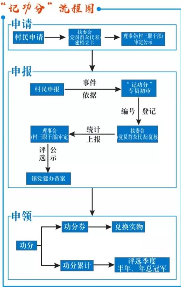 ●从党员群众代表中公选三人组成“记功分”执行委员会负责记分具体事宜,由村三职干部组成“记功分”理事会负责审定、核查,坚持“好人好事记正分,坏人坏事记负分”的动态记分的原则,做到一天一记分、一周一统计、一月一公示、一季一评比。