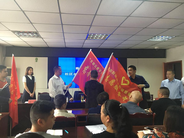 9月17日,河东新区慈音街道办为6个社区举行“党员志愿服务中队”授旗仪式。
