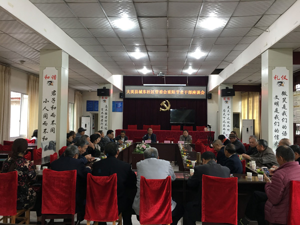为弘扬中华敬老爱老优秀文化,充分发挥老干部老党员的积极性与先进性,10月16日,大英县城东社区组织召开以“金秋重阳,畅谈‘硕果’与发展”为主题的老干部座谈会。