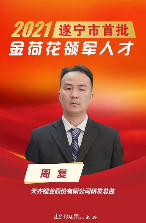 周复,博士研究生,天齐锂业股份有限公司研发总监,2021年入选遂宁市首批“金荷花领军人才”。