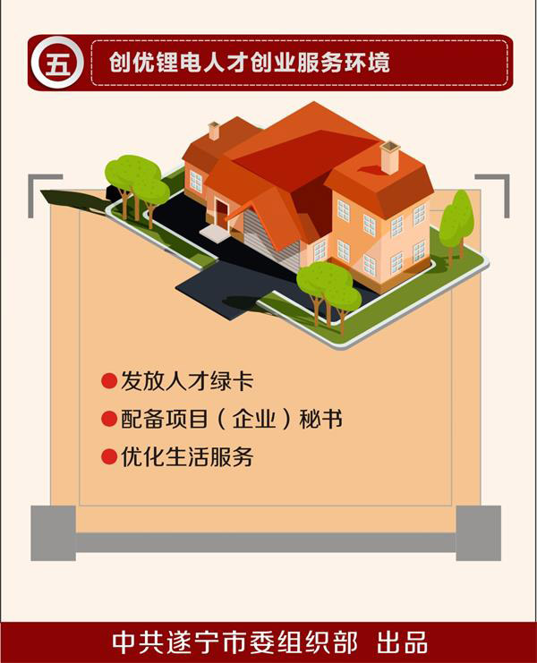 11.发放人才绿卡。在“遂州英才卡”中划定一定名额用于锂电产业人才。支持锂电企业在成都等市外建立研发中心和产业研究院,对入驻平台的高端人才,符合条件的颁发“遂州英才卡”,积极协调成都相关部门,享受两地相关公共配套资源。