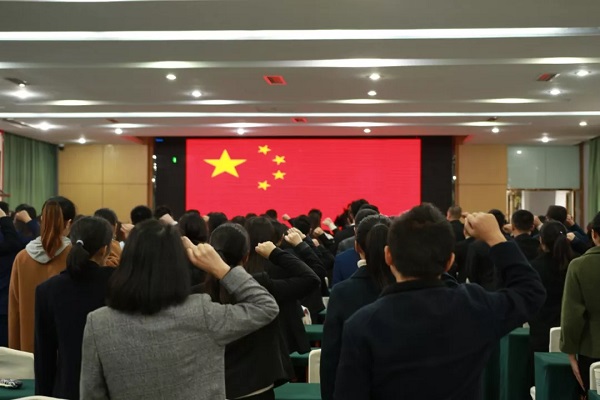 宣誓仪式上, 115名初任公务员齐唱中华人民共和国国歌。面对鲜艳的五星红旗,全体学员精神抖擞,意气风发进行庄严宣誓。